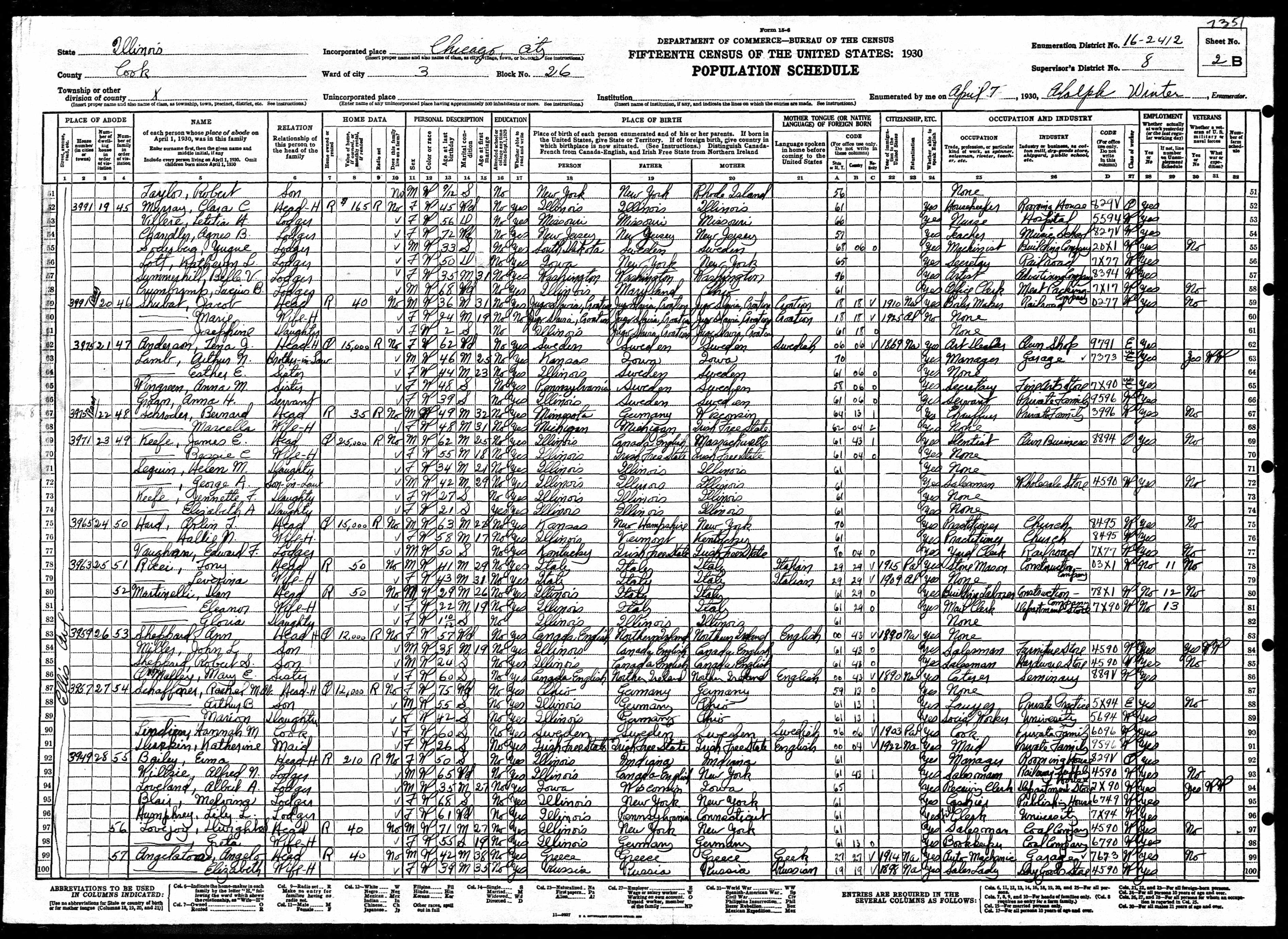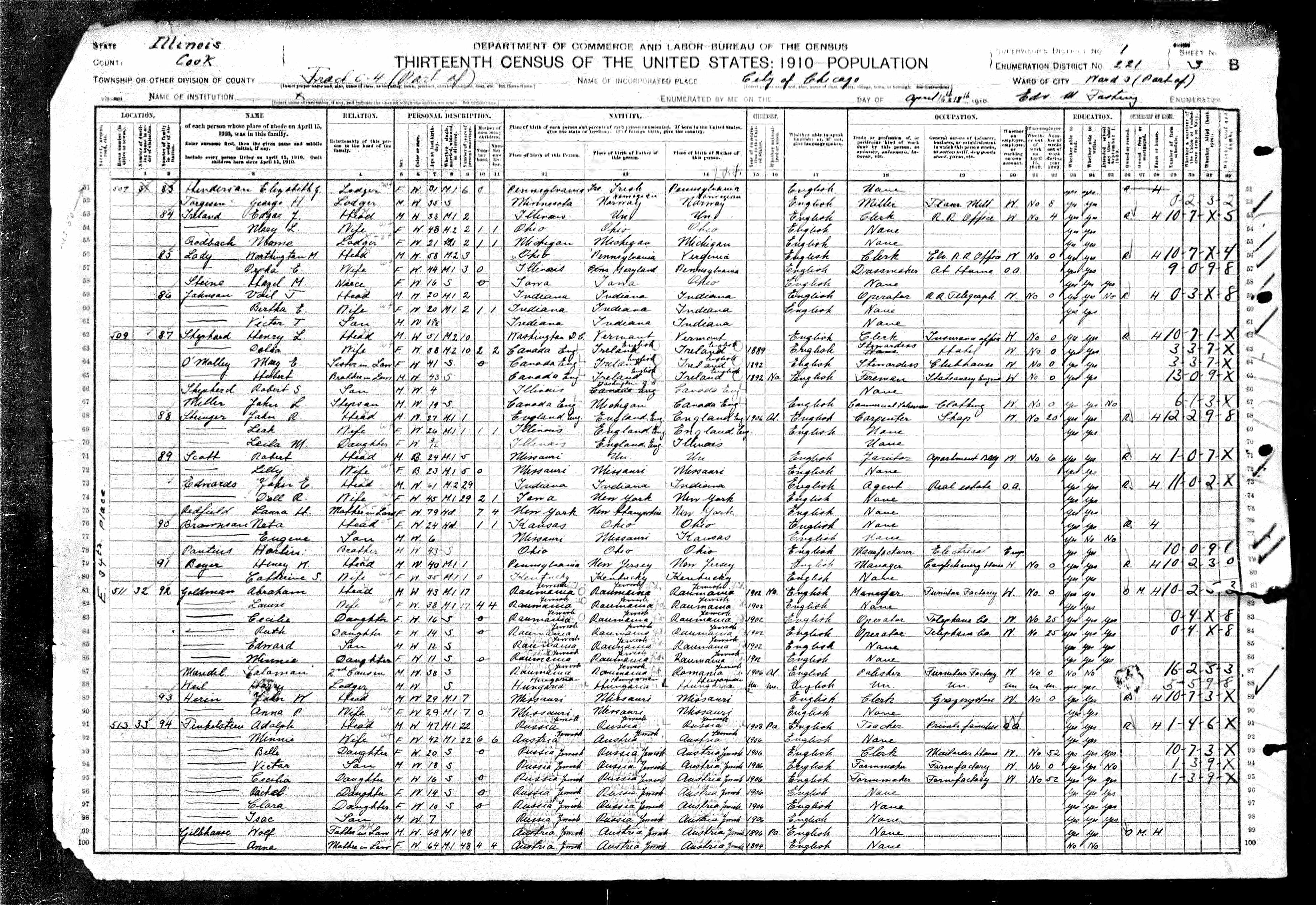 None of the John Millers in the 1910 Chicago city directory seem to be a good match for the John listed above. Lucky break for me that John’s aunt and uncle live with his family in the 1910 census! Mom’s maiden name appears on both the marriage record above and the census record below.  John’s occupation was difficult to read, but I got help from members of the Cook County list on Rootsweb. We believe it says Commercial Salesman, Clothing. Seeing the census record leads me to believe John may have fudged his age a little at his wedding.