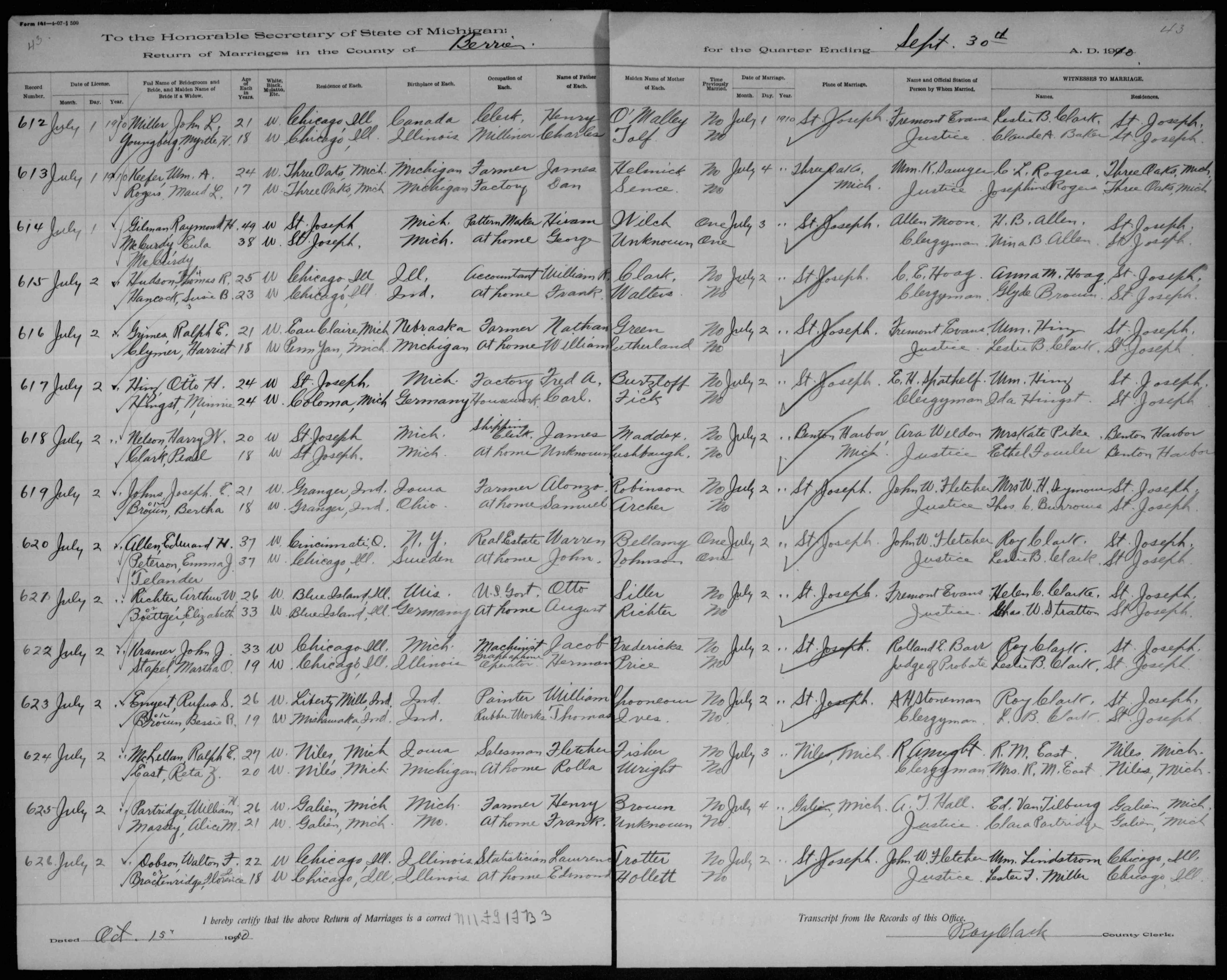 Myrtle H Youngberg and John L Miller were married 01 Jul 1910 in Michigan at a popular destination for elopements: