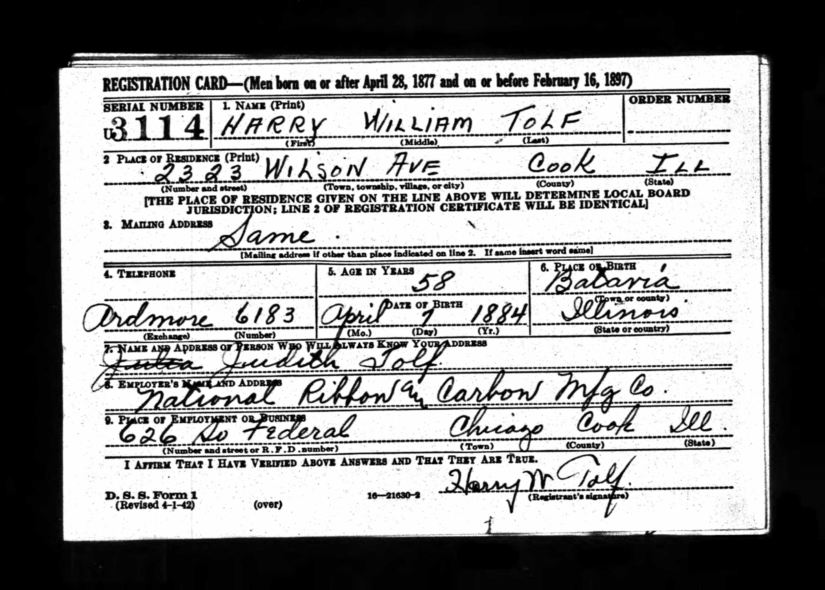06 November 1962 – My great-grandfather’s 2nd wife Judith T. (Peterson) TOLF died in Chicago, Cook, Illinois. A second look at her entry on my family tree showed a missing marriage date. This reminded me to scan the divorce papers showing the dissolution of Harry TOLF’s 1st marriage (to my great-grandmother Julia THOMPSON). And provided a moment of levity when I saw Harry’s draft registration. Perhaps he should have married women with less-similar names: