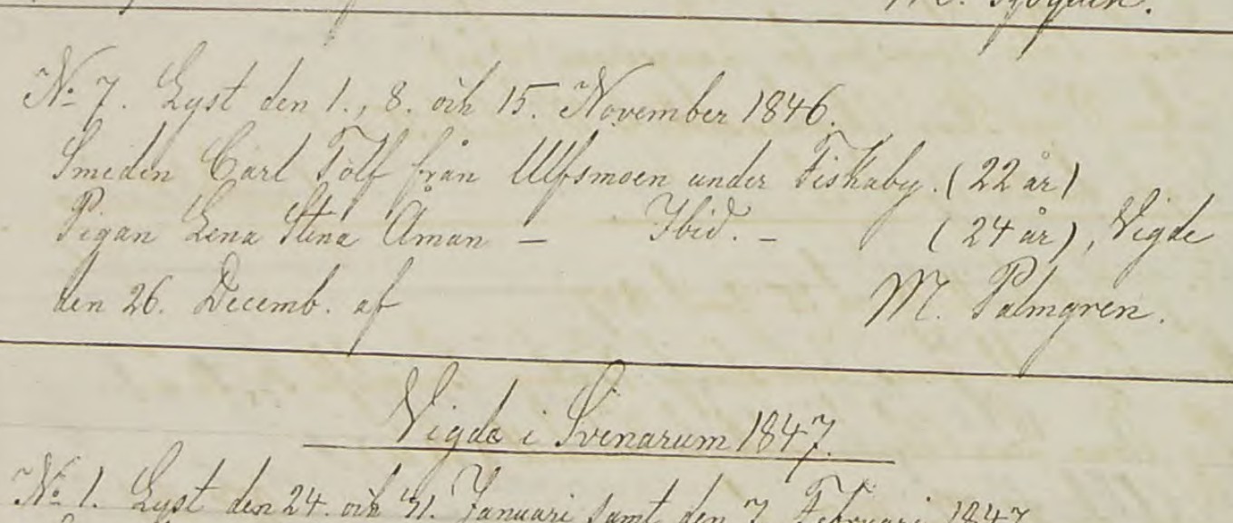 26 Dec 1846 – On this day, my 3rd great-grandparents Helena Christina Ă…man and Carl Tolf were married in Sweden; see image below. Their banns were posted on the 1st, the 8th and the 15th of November. The couple immigrated to Batavia Illinois in 1878 with four of their children. (The oldest four children awaited their arrival in the U.S.) A second look at their entries on my tree reminded me that I still don’t know the specifics of their final resting place/s. Let the quest begin anew!
