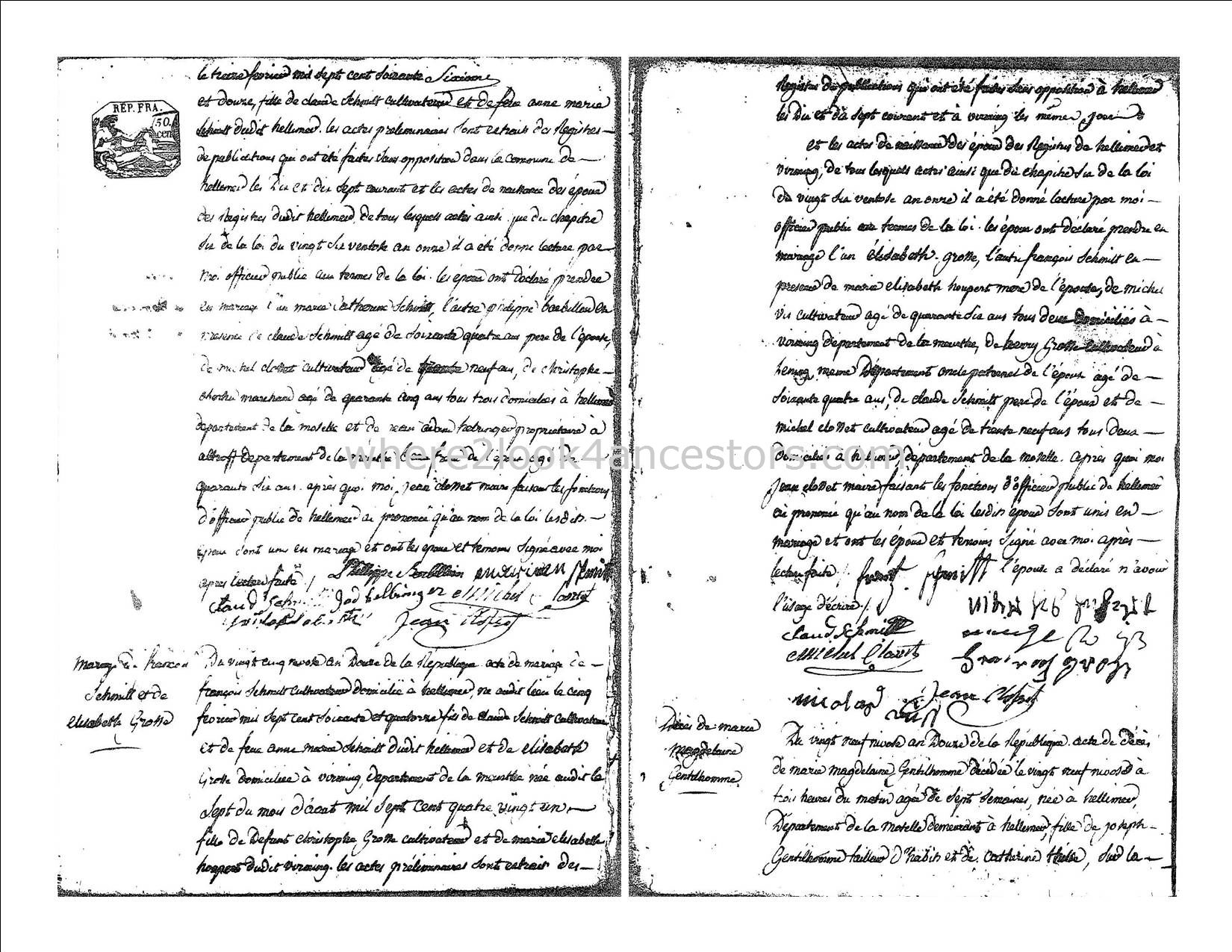 “[Prepared] on the 25th (day) of the month of Nivôse, year Twelve of the (French) Republic (Calendar), the marriage certificate of François Schmitt, a farmer living in Hellimer, born in that same town on February 5, 1774, son of Claude Schmitt farmer and the late Anne Marie Schmitt of Hellimer; and Elisabeth Grosse who lives in Virming, department of Meurthe born the seventh of August 1781, daughter of the late Christopher Grosse, farmer and Mary Elizabeth Houpert from Virming.