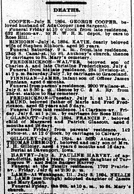 The following obituaries appeared on page 5 of the July 5, 1894 issue of the Chicago Daily News: