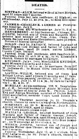 “LOFTUS-WILLIE, beloved son of Owen and Bridget Loftus, aged 4 years 11 months and 17 days. Funeral from parents’ residence, 327 S. May-st., Wednesday, July 11, at 11 a.m., by cars to Calvary via C., M. and St. P.”
