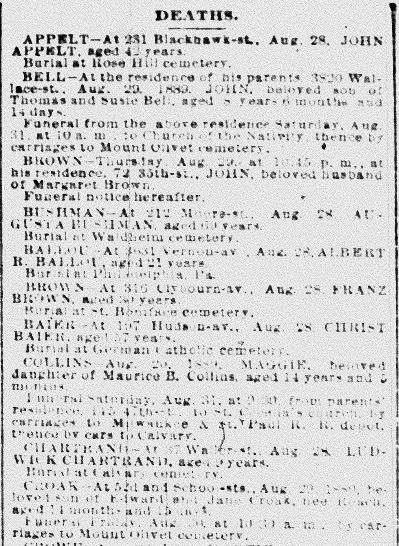 “APPELT-At 231 Blackhawk-st., Aug. 28, JOHN APPELT, aged 42 years. Burial at Rose Hill cemetery.”