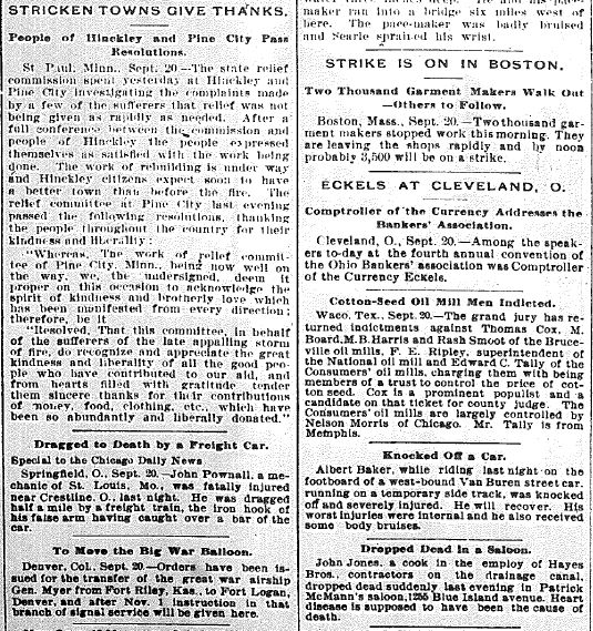 The following item appeared on page 1 of the September 20, 1894 issue of the Chicago Daily News;