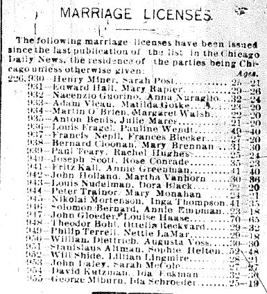 26 marriage licenses were issued recently in the city of Chicago. The December 10, 1894 issue of the Chicago Daily News listed the names of the soon-to-be-married on page two: