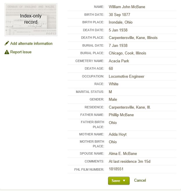 There is more than one William J. McBane born in Ohio in 1877. More than one who worked for the railroad. More than one who was married, divorced and married again. More than one who had an Ada, or Ida, or Mabel in their family. My head was spinning by the end of this research day. And although I had learned some interesting things about the McBanes and the Wyckoffs, I hadn’t found the information I wanted: the birthplace of my 2nd great-grandfather.