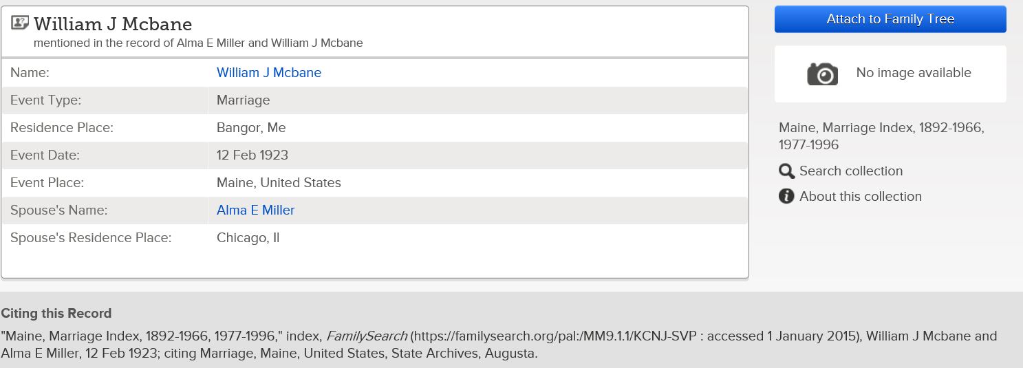 But my search was not fruitless. Maine appears to have been a job transfer for William. Alma followed him and they were married near the place they would call home for a number of years. Then they returned to Illinois where their families lived. Makes sense.