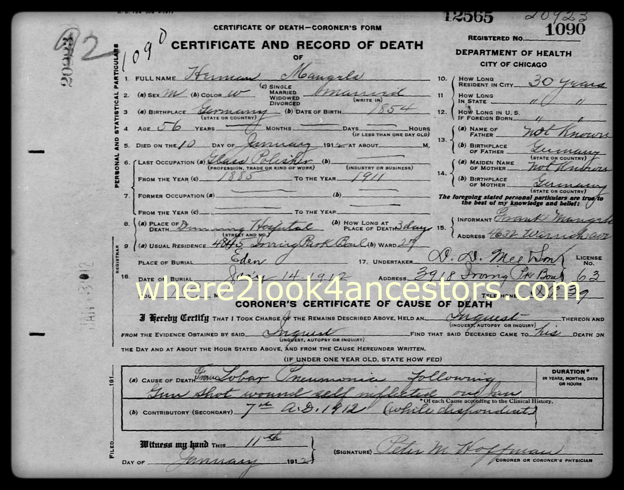I wondered if there had been some truth to the family story. Maybe Herman shot himself because his wife Mary refused to let him in the house. The death certificate mentions an inquest, so I requested a copy. The story it told broke my heart.