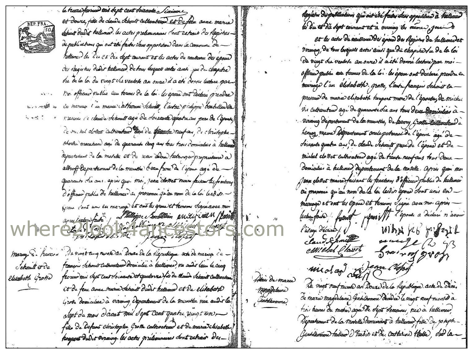 [Prepared] on the 25th [day] of the month of Nivôse, year Twelve of the [French] Republic [Calendar], the marriage certificate of François Schmitt, a farmer living in Hellimer, born in that same town on February 5, 1774, son of Claude Schmitt farmer and the late Anne Marie Schmitt of Hellimer; and Elisabeth Grosse who lives in Virming, department of Meurthe born the seventh of August 1781, daughter of the late Christopher Grosse, farmer and Mary Elizabeth Houpert from Virming.