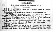 The following death notices appeared in one column on page 6 of the April 30, 1892 issue of the Chicago Daily News; F. A. Bird, Paul Grantham, Lizzie C. Kennedy and part one of James Kilroy: