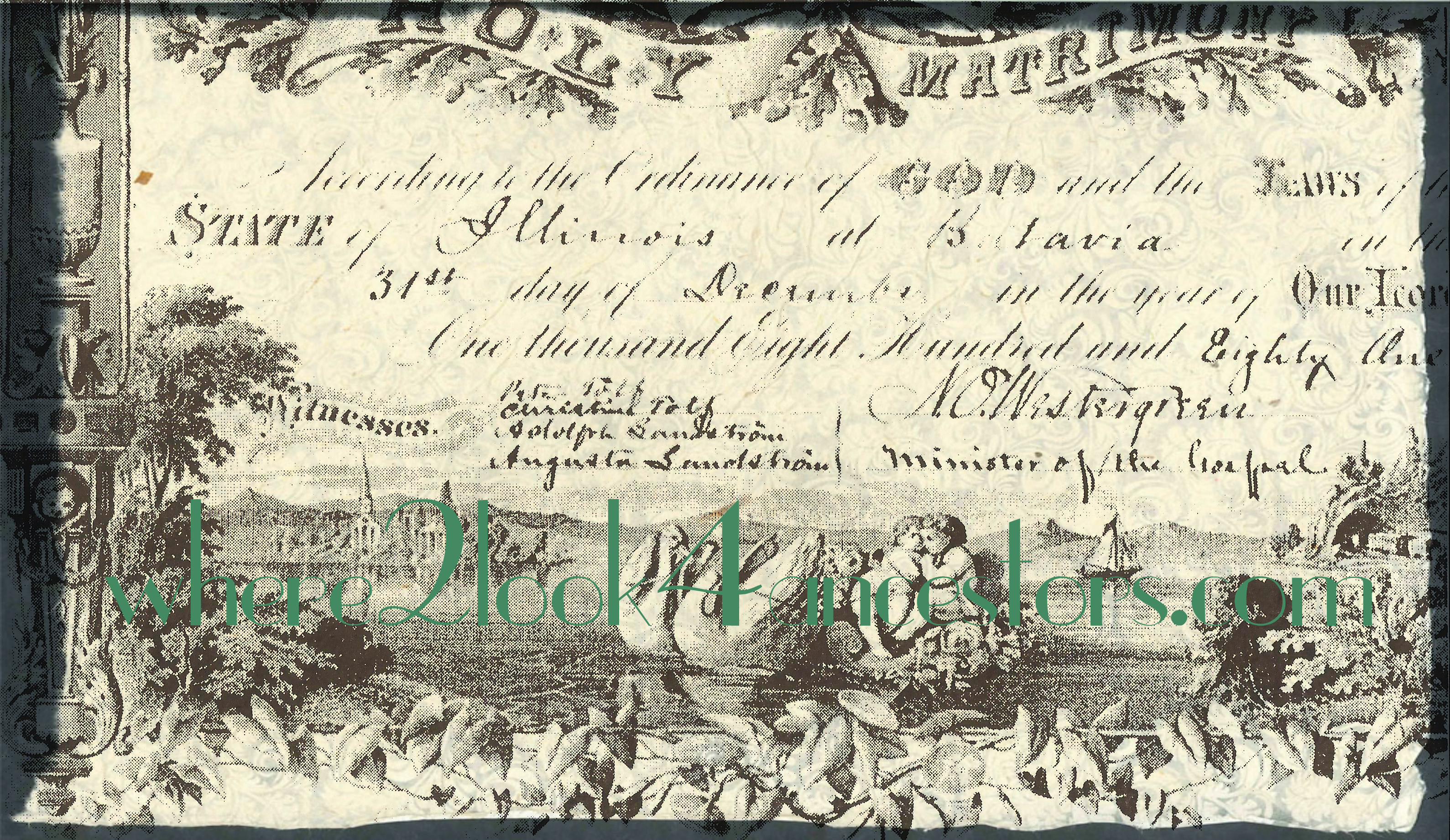 But it was actually only one couple, Peter Tolf and Augusta Landstrom. They each brought a sibling to act as witnesses when Peter and Christine’s brother Frans Tolf married Matilda Peterson on the 31st of December 1881 in Batavia, Kane, Illinois.