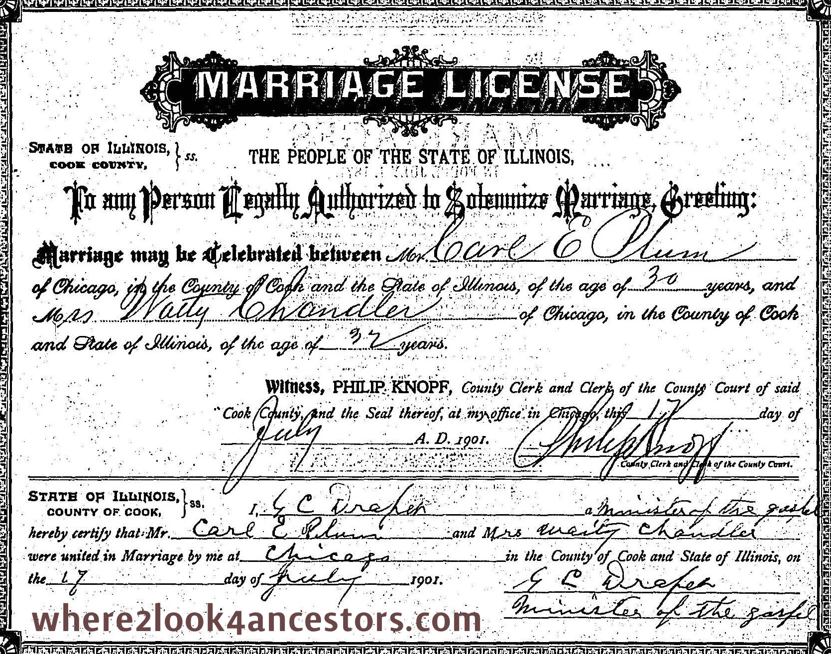 Until recently, I didn’t know much more than that about Waity Chandler Plum. According to the marriage certificate below, she was 32 years old when she married Carl E. Plum in July of 1901: