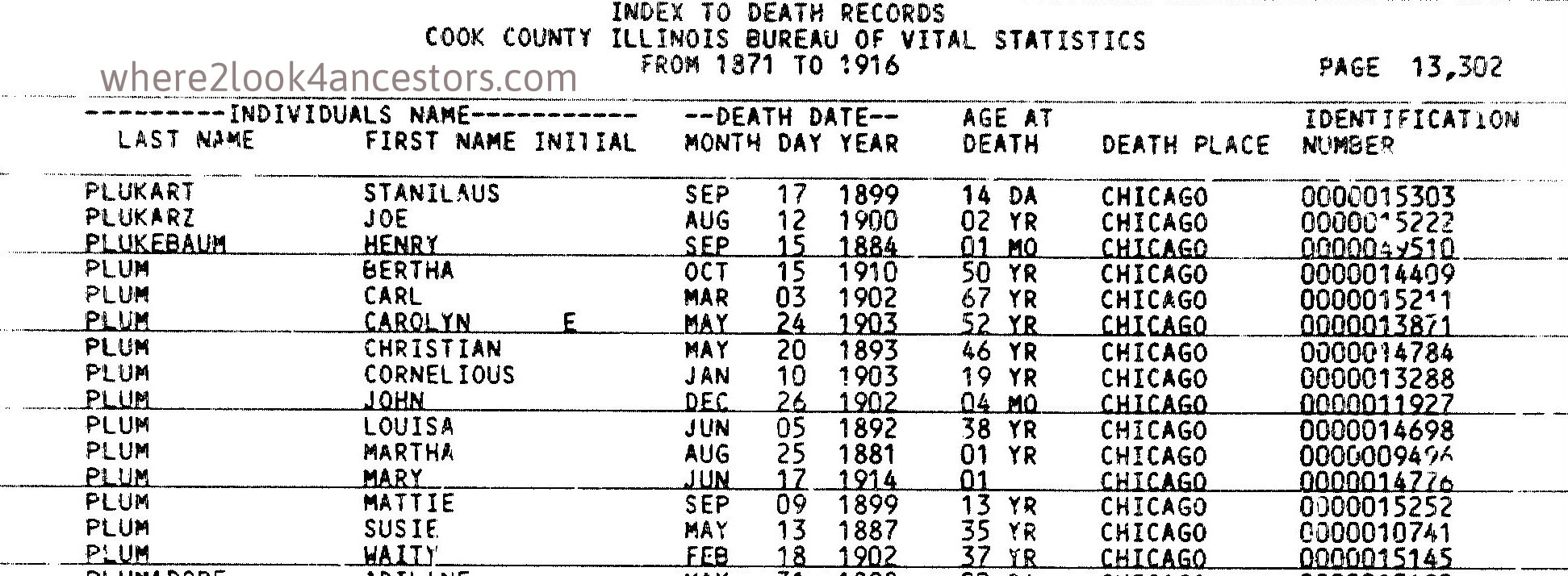 From the February 19, 1902 edition of the Chicago Daily News; “PLUM – WAITY PLUM, beloved wife of Carl E. Plum, mother of Bessie Plum , Feb. 18, aged 37 years and 1 month. Funeral from her sister’s residence, 13 E. 29th pl., Thursday at 2 p.m., to Oakwoods.”
