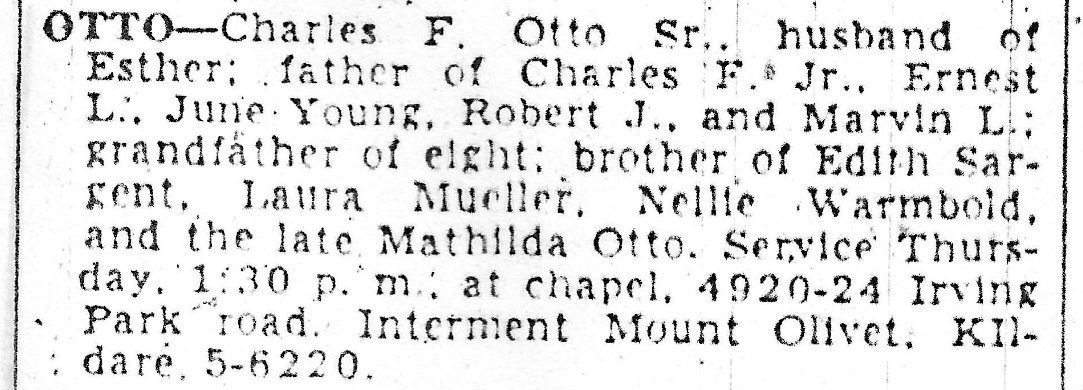 My paternal great-grandmother’s 2nd husband died 27 Feb 1956. My dad’s recollection of Charlie Otto’s death was that he had stepped off a curb and was hit by a CTA bus.