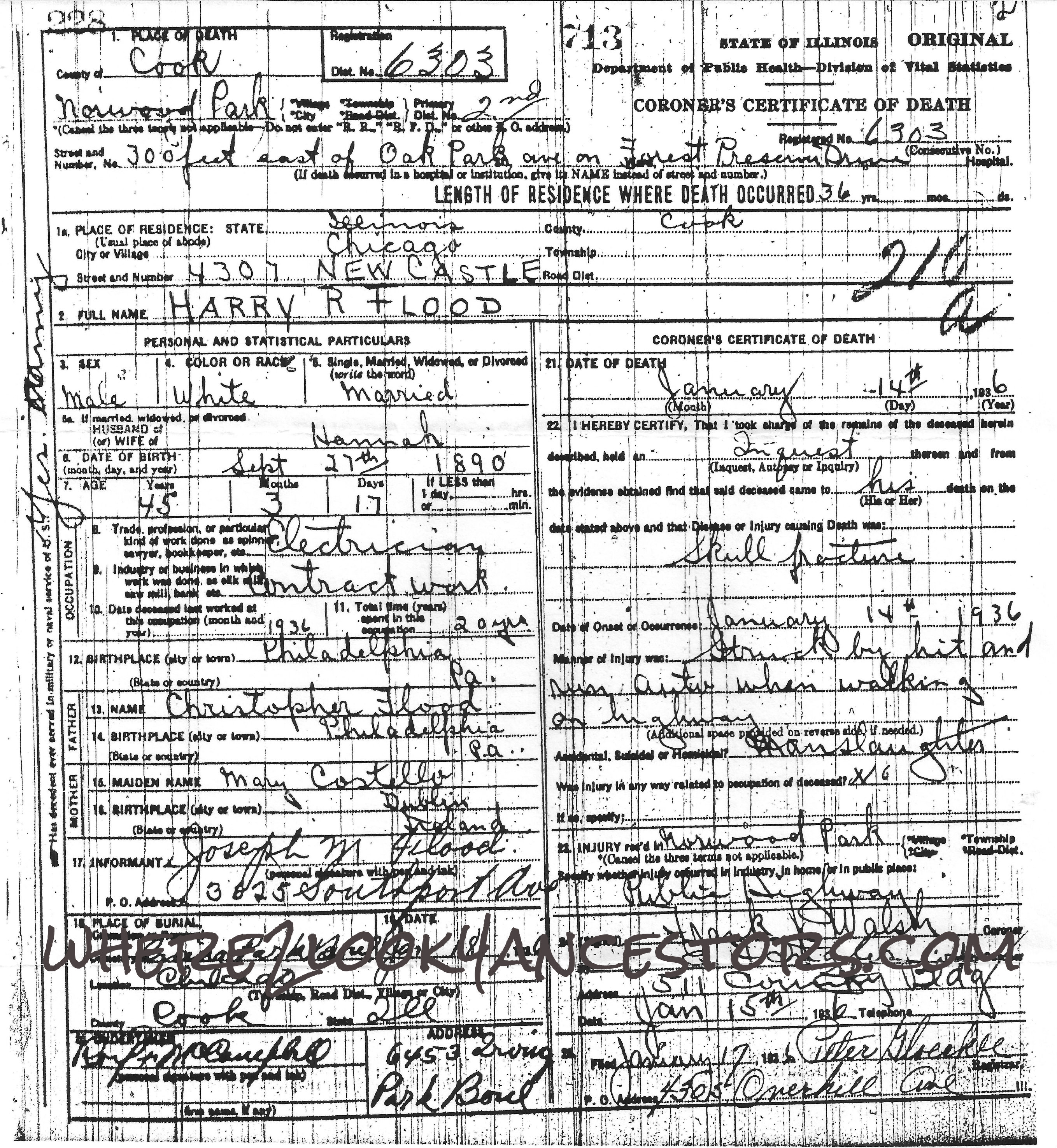 Twenty years earlier my maternal great-grandmother’s second husband Harry Flood died after being hit by a car:
