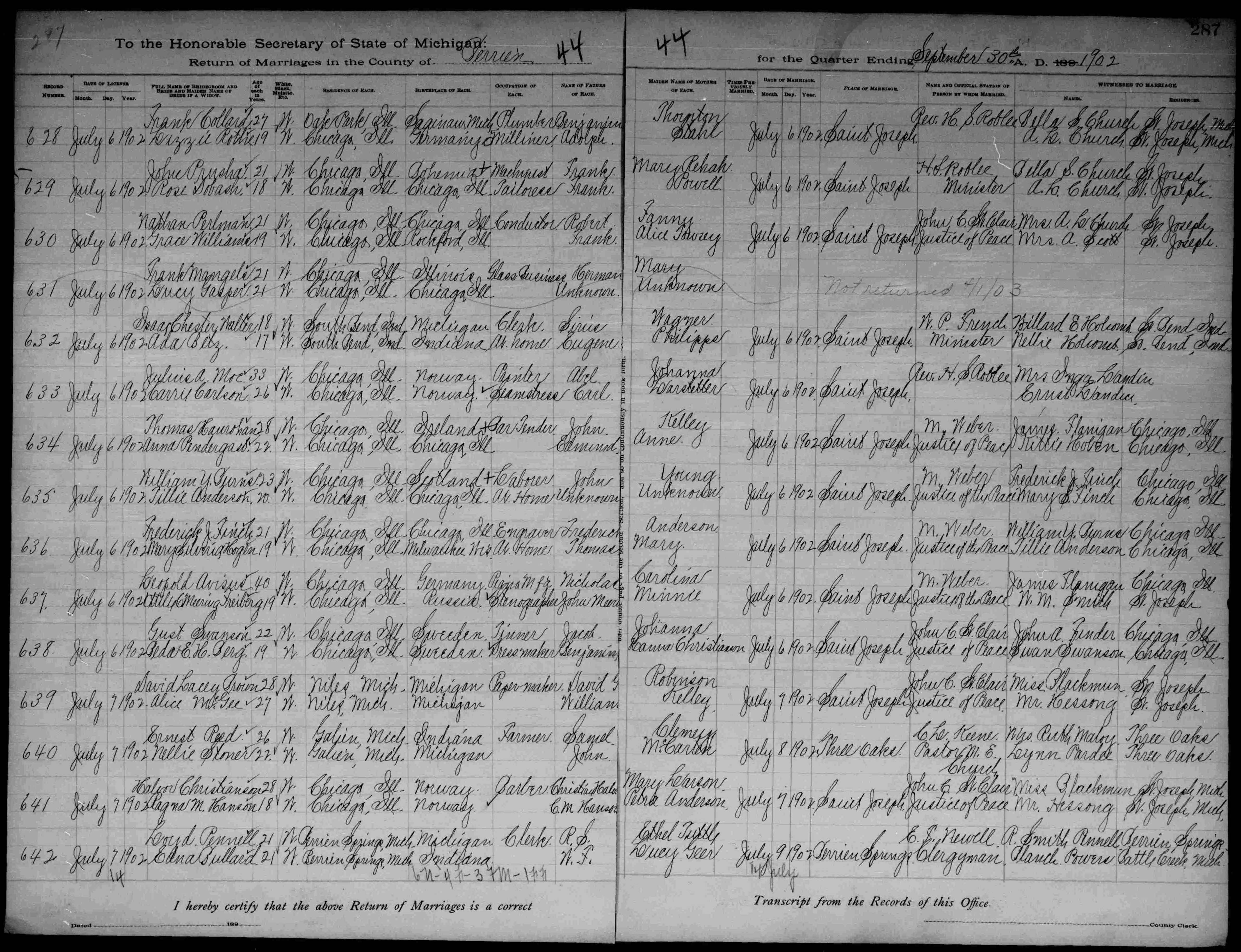 So as it turns out, the incomplete Berrien marriage register proves the couple named on the Chicago marriage certificate is the right couple.