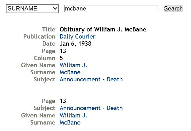 This information made locating John’s obituary a snap in the library’s extensive microfilm collection. Unfortunately Alma did not appear in the online index. She died 10 Jun 1967.