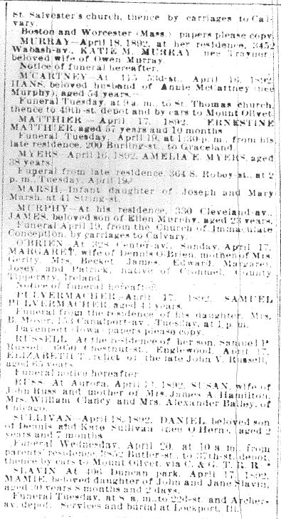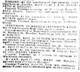 The following names appeared in the “deaths” column of page 9 in the April 18, 1892 issue of the Chicago Daily News: