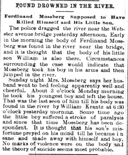 A tragedy was reported on page 3 of the April 5, 1892 issue of the Chicago Tribune. Ferdinand Mossberg and his little son William were found by William Krantz. The pair had drowned. It appears to have been a deliberate act by Mr. Mossberg: