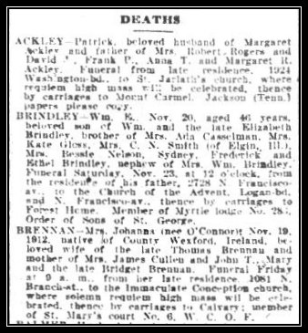 “BRINDLEY-Wm. E., Nov. 20, aged 46 years, beloved son of Wm. and the late Elizabeth Brindley, brother of Mrs. Ada Casselman, Mrs. Kate Gloss, Mrs. C. N. Smith (of Elgin, Ill.), Mrs. Bessie Nelson, Sidney, Frederick and Ethel Brindley, nephew of Mrs. Wm. Brindley. Funeral Saturday, Nov. 23, at 12 o’clock, from the residence of his father, 2728 Francisco-av., to the Church of the Advent, Logan-bd. and N. Francisco-av., thence by carriages to Forest Home. Member of Myrtle lodge No. 283, Order of Sons of St. George.”