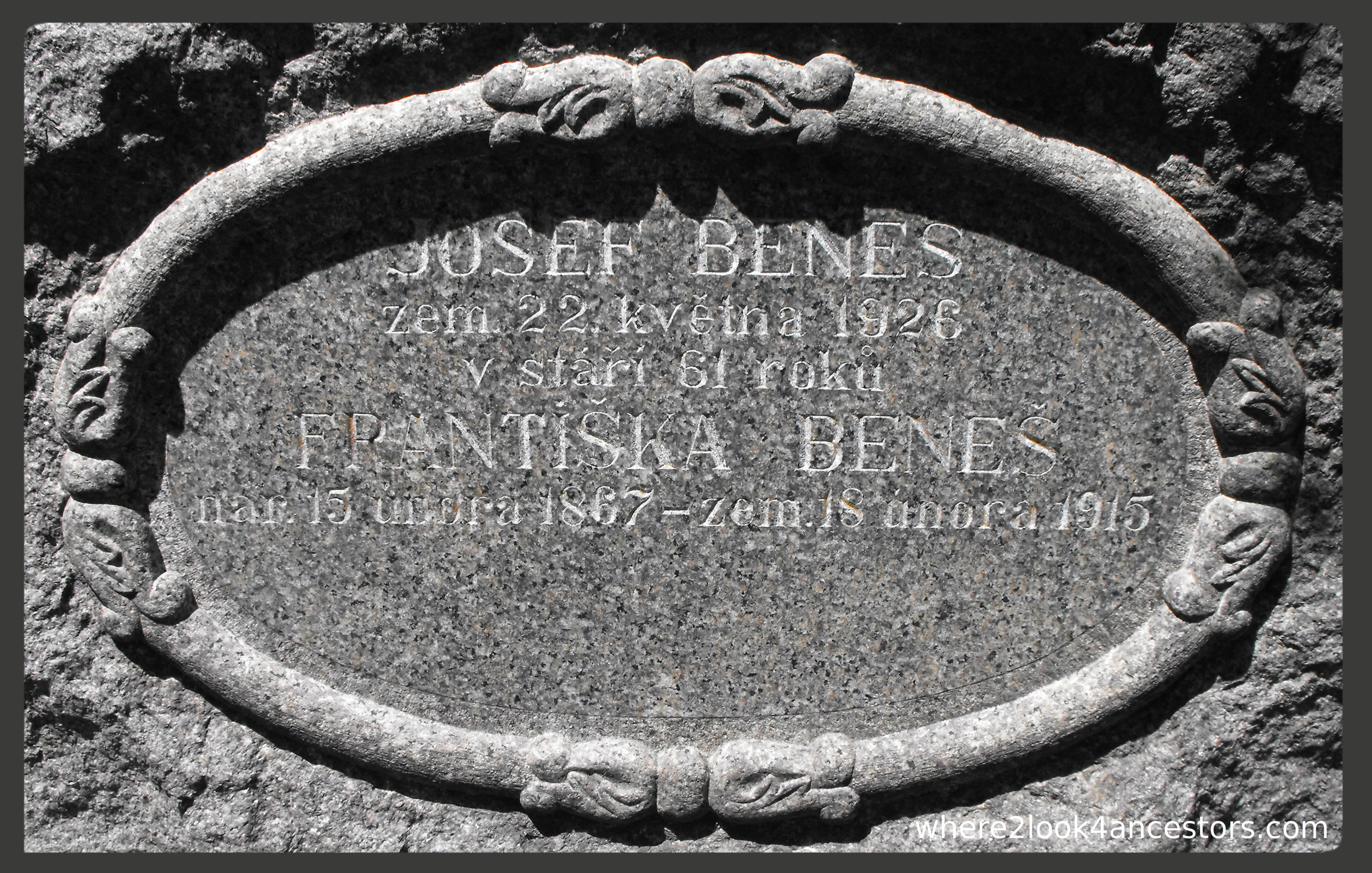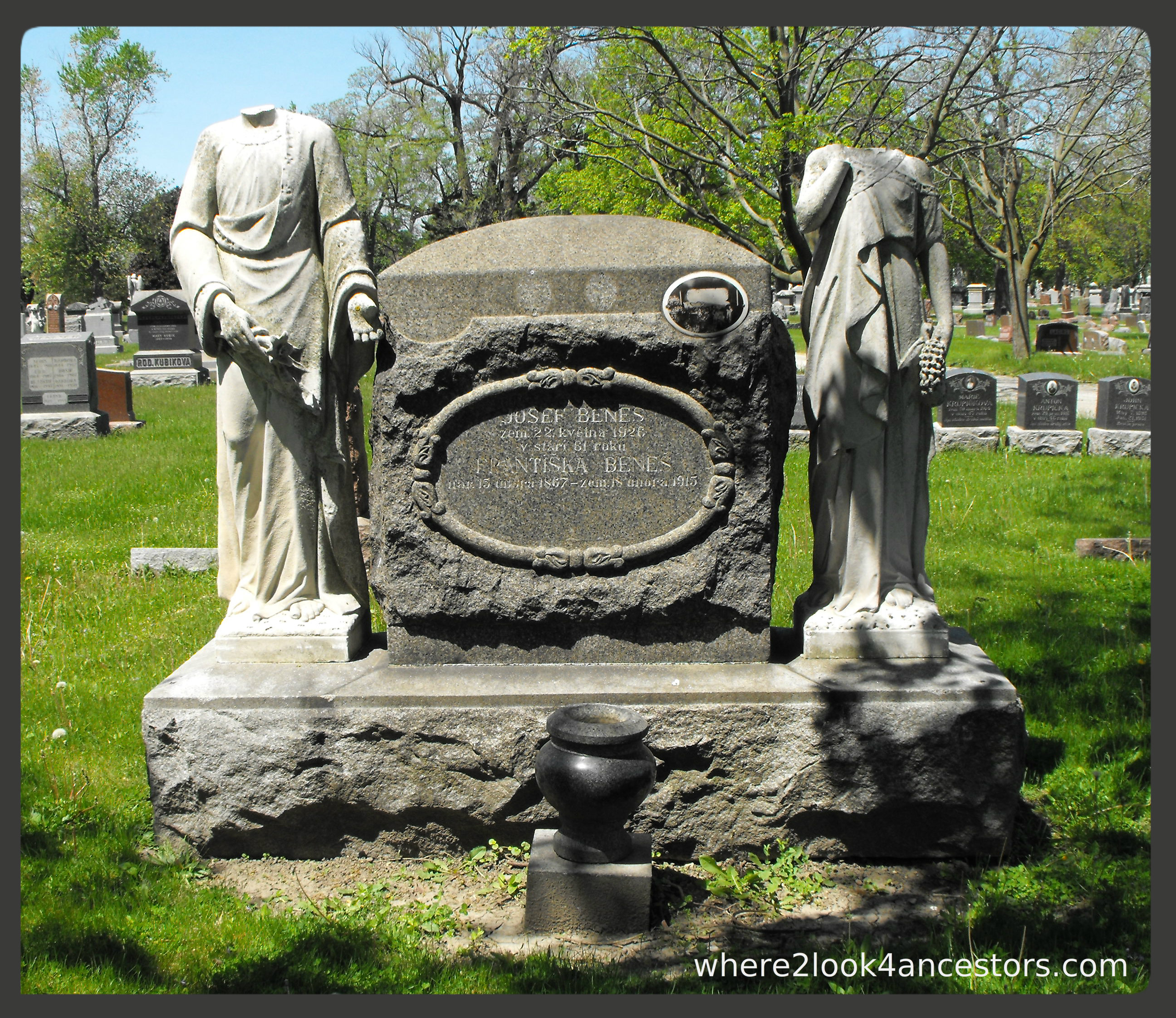 Although there are at least three memorial pictures (and two heads) missing from this large headstone in Chicago’s Bohemian National Cemetery, the photograph that remains provides a plethora of genealogical clues.