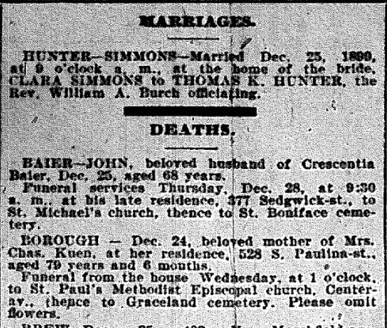 “BOROUGH-Dec. 24, beloved mother of Mrs. Chas. Kuen, at her residence, 528 S. Paulina-st., aged 79 years and 6 months. Funeral from the house Wednesday, at 1 o’clock, to St. Paul’s Methodist Episcopal church, Center-st., thence to Graceland cemetery. Please omit flowers.”
