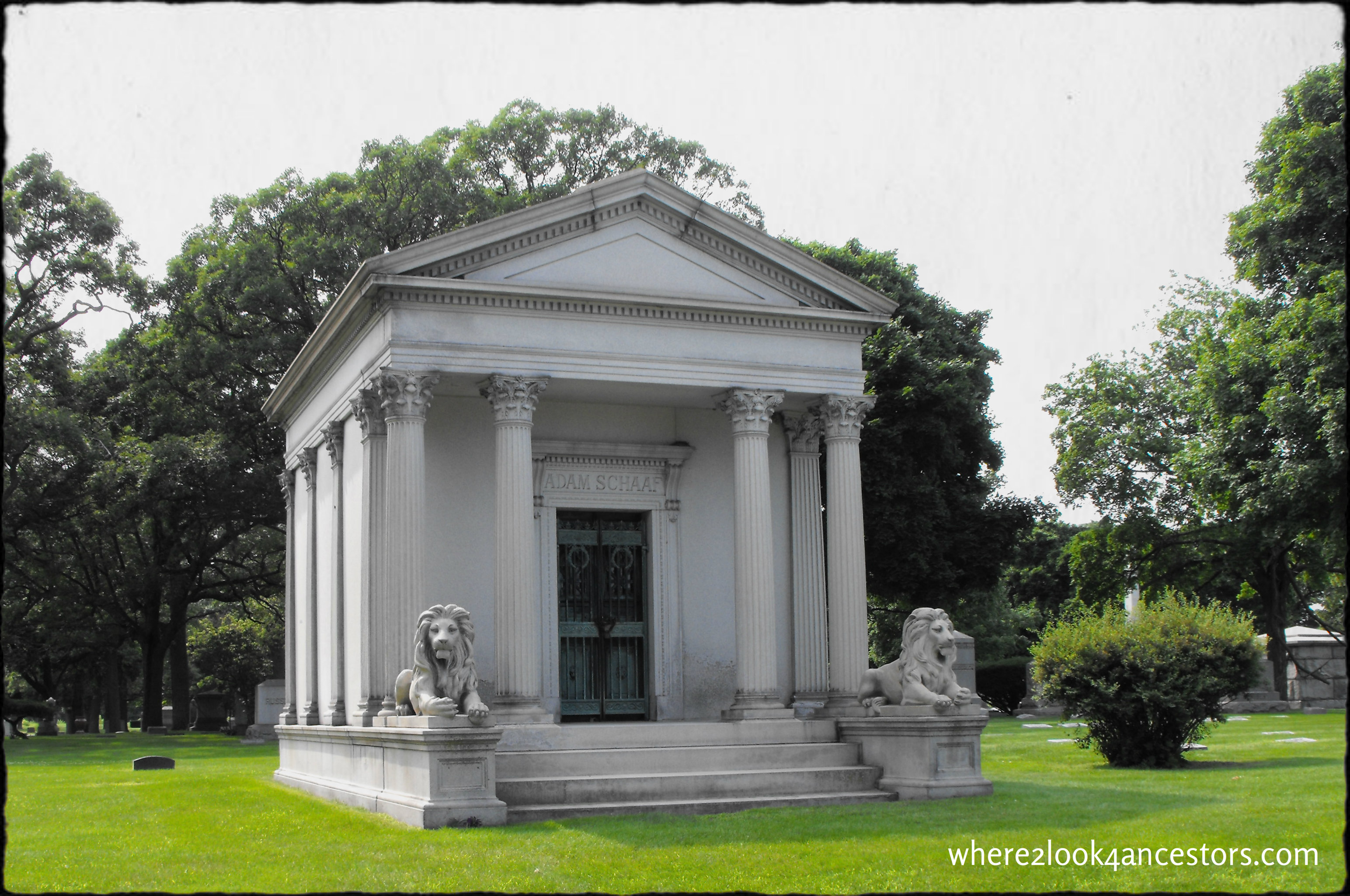 A link on the baby’s memorial page encourages Find A Grave users to “Find all Schaafs in Rosehill Cemetery”. Adam had been memorialized, but there wasn’t much information there. A family link connected him with his wife Caroline (nee Blasius) Schaaf. Her obituary explained the accomplishments of the Schaaf family and how they may have come to own such an elaborate monument.