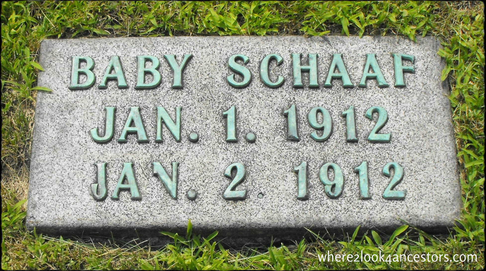 Adam Schaaf died in 1902, so he couldn’t be the father of the infant born in 1912. The family links on his and his wife’s memorials show two sons. Was one of them Baby Schaaf’s father?