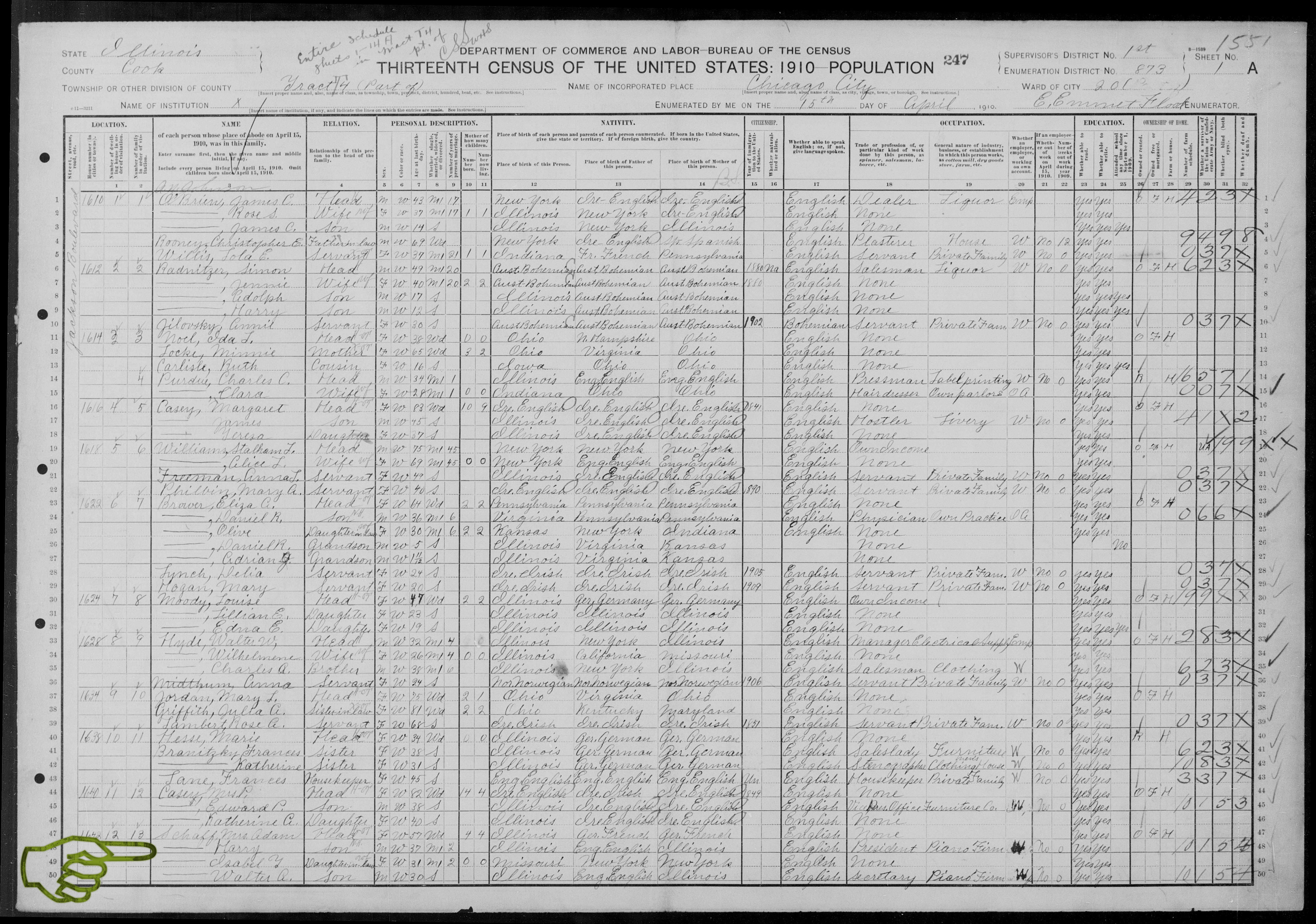 [1]”United States Census, 1910,” database with images, FamilySearch(https://familysearch.org/ark:/61903/1:1:MKZH-81D: accessed 22 March 2016), Isabel T Schaff in household of Mrs. Adam Schaff, Chicago Ward 20, Cook, Illinois, United States; citing enumeration district (ED) ED 873, sheet 1A, NARA microfilm publication T624 (Washington, D.C.: National Archives and Records Administration, n.d.); FHL microfilm 1,374,275.