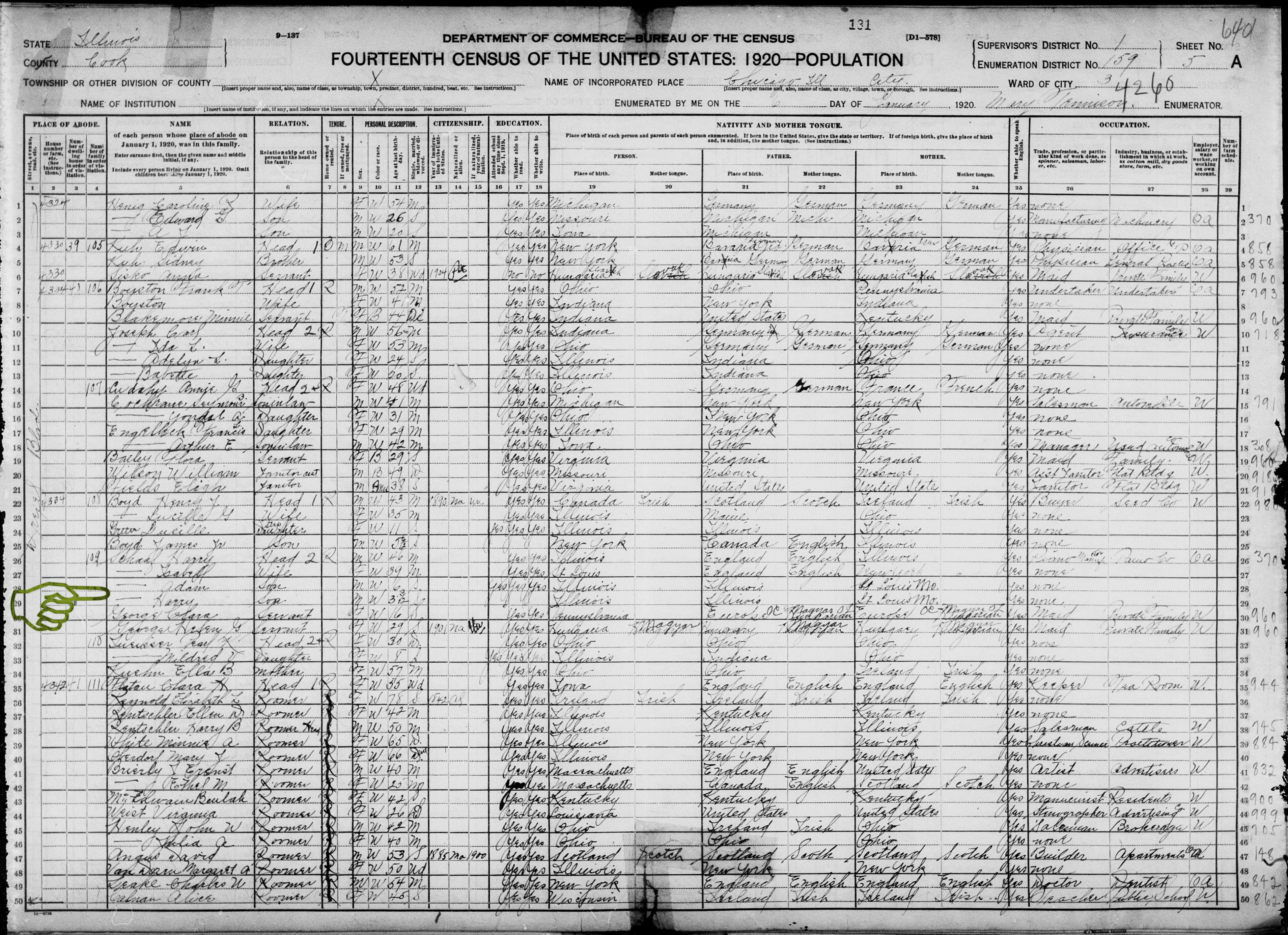 [2]”United States Census, 1920,” database with images, FamilySearch(https://familysearch.org/ark:/61903/1:1:MJ3M-GXC: accessed 22 March 2016), Isabell Schaaf in household of Harry Schaaf, Chicago Ward 3, Cook (Chicago), Illinois, United States; citing sheet 5A, NARA microfilm publication T625 (Washington D.C.: National Archives and Records Administration, n.d.); FHL microfilm 1,820,313.