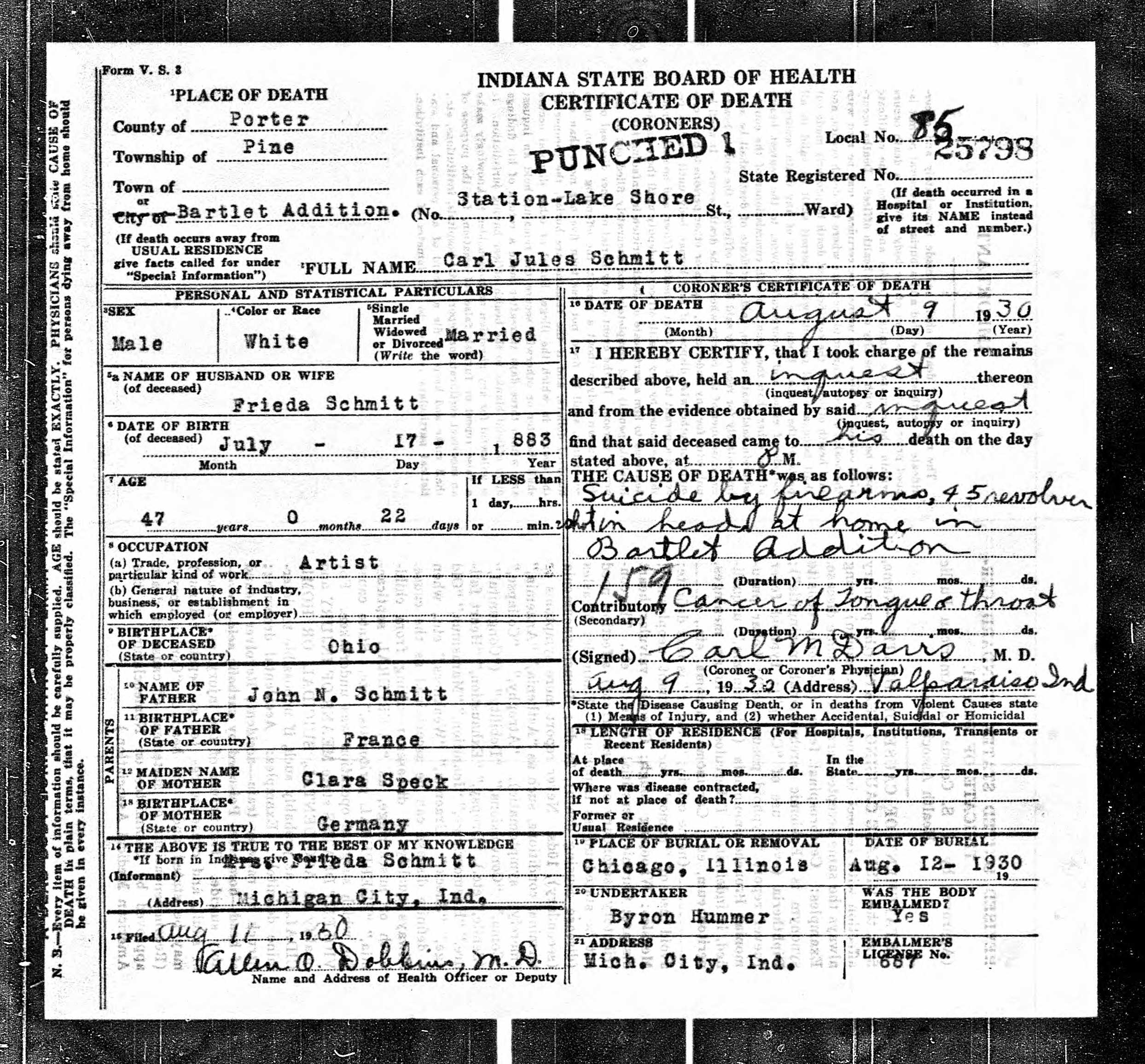 What little I knew of Carl was that he had been a successful commercial artist for the Barnes-Crosby Company in Chicago. He married fairly late in life and moved to Indiana. He and his parents are buried in Evergreen Park Illinois but his wife doesn’t appear to be with them. Her name was illegible in census records and with a common surname like Schmitt, the trail had quickly gone cold.