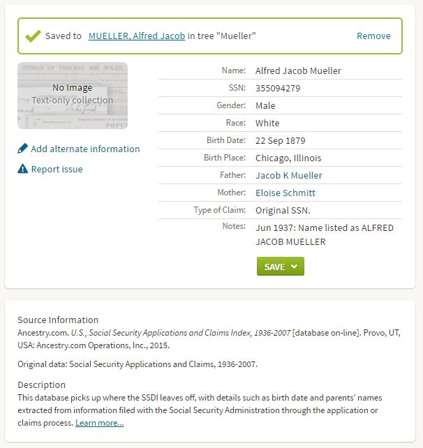 One of those documents listed Alfred’s exact date of birth, the very thing I was trying to prove. According to Ancestry, the Social Security Applications and Claims Index “picks up where the SSDI leaves off with such details as birth date and parents’ names extracted from information filed with the Social Security Administration through the application or claims processes”.