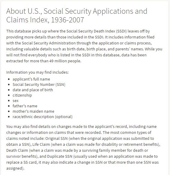 I was surprised to read that more than 49 million people are included in this database. The three most common types of claims are the original Social Security number application, a life claim, and a duplicate Social Security Number application. Of the three, the original application seemed the one most likely to provide the information I needed.