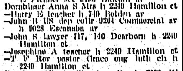 According to his listing on page 378 the 1910 Chicago City Directory shown here, T. F. Dornblaser was the pastor of the Grace eng luth ch and resided at 2249 Hamilton ct.