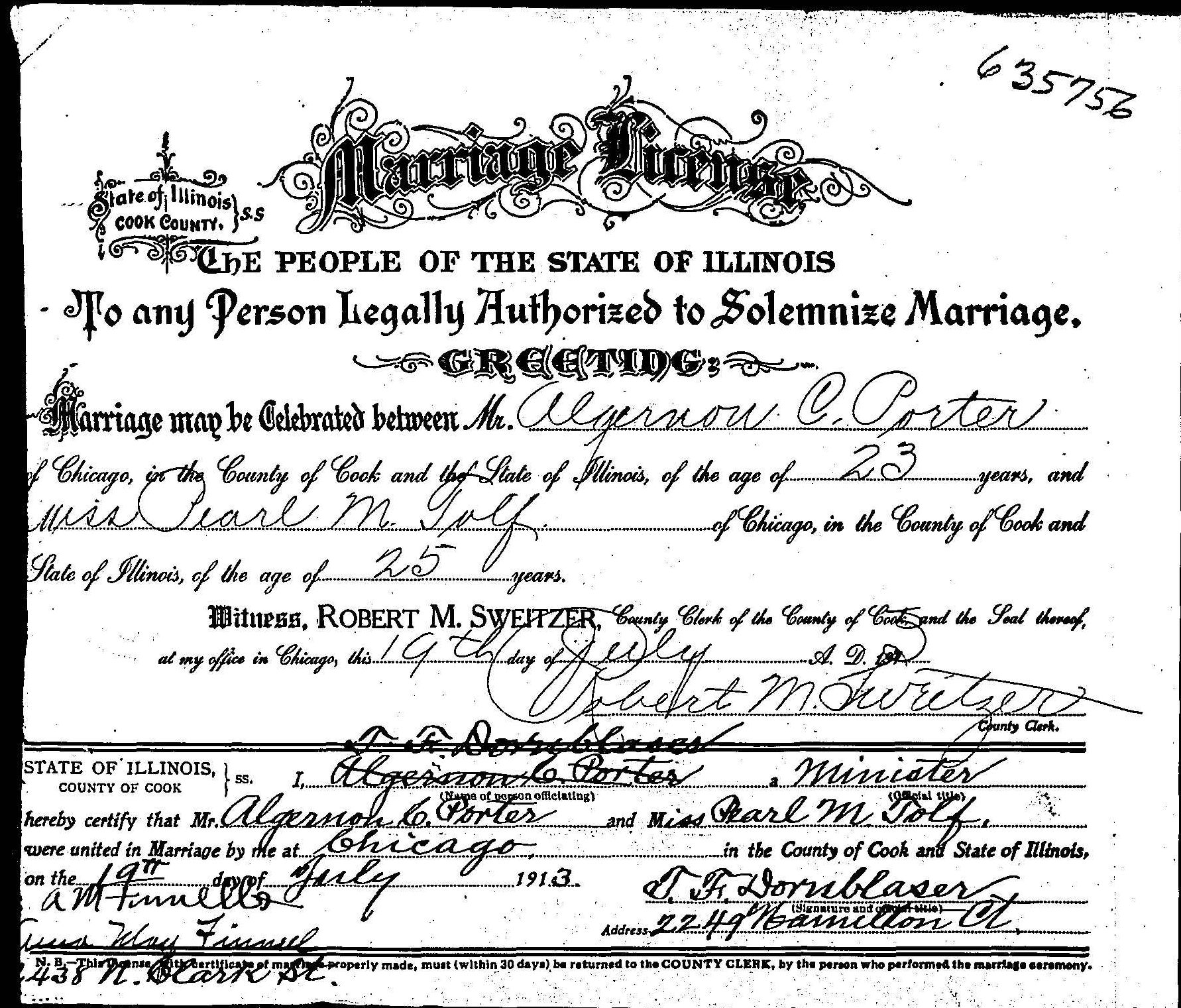 STATE OF ILLINOIS, COUNTY OF COOK } ss, I, (name of person officiating) Algernon C. Porter T. F. Dornblaser, a Minister, hereby certify that Mr. Algernon C. Porter and Miss Pearl M. Tolf, were united in Marriage by me at Chicago, in the County of Cook and State of Illinois, on the 19th day of July 1913.