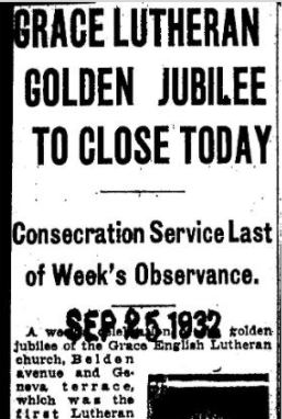 In the front of the 1910 Chicago City Directory are church listings. Grace Lutheran Church appears on page 15, under General Synod. Northern Illinois Synod. English. The church was on the corner of Belden av. and Hamilton ct.