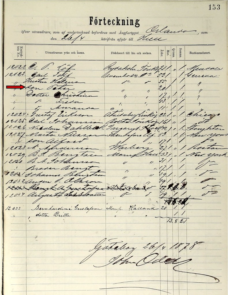 In the fall of 1872 14-year-old Pehr accompanied his sister Karolina Fredrika to the parish office. They both took out emigration papers. Karolina used hers to board a ship bound for America, but Pehr (now called Peter) returned home.