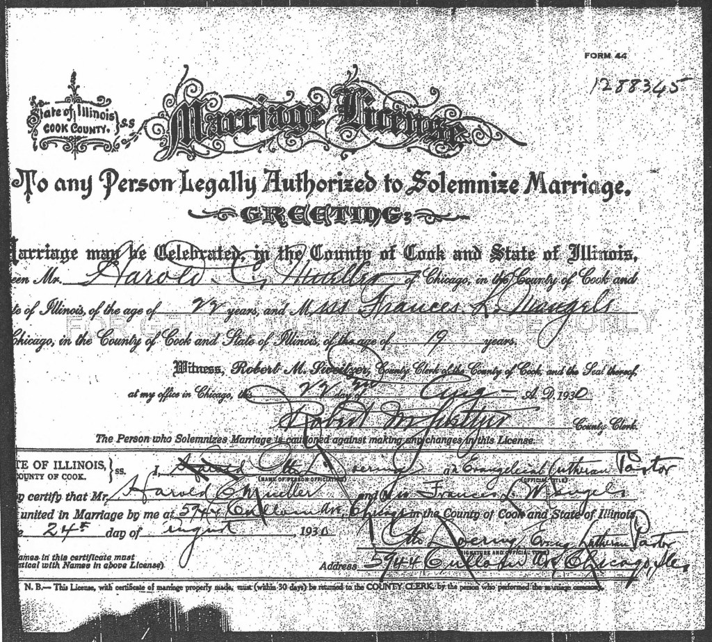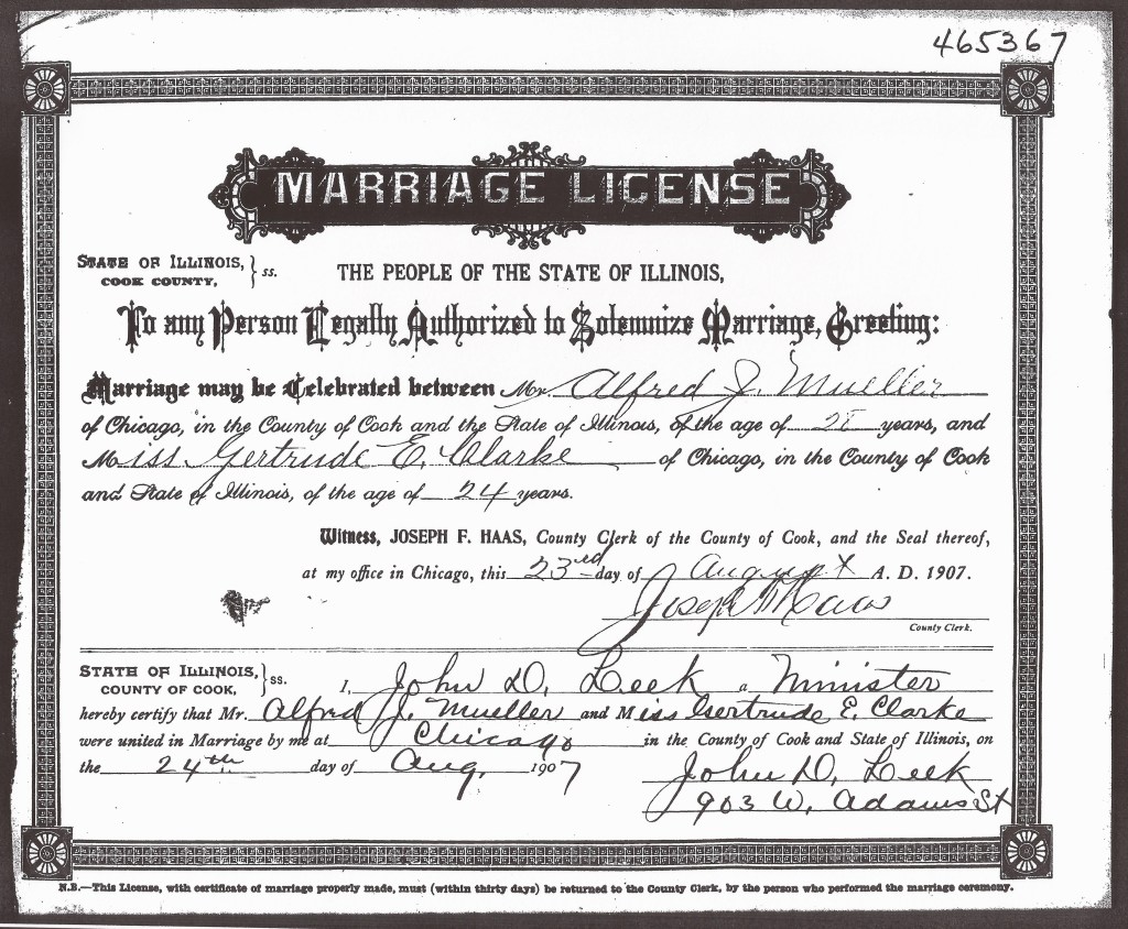 Harold’s parents, my paternal great-grandparents Alfred Jacob Mueller and Ellen Gertrude Clarke were also married in Chicago, also on August 24th. Their wedding took place in 1907.